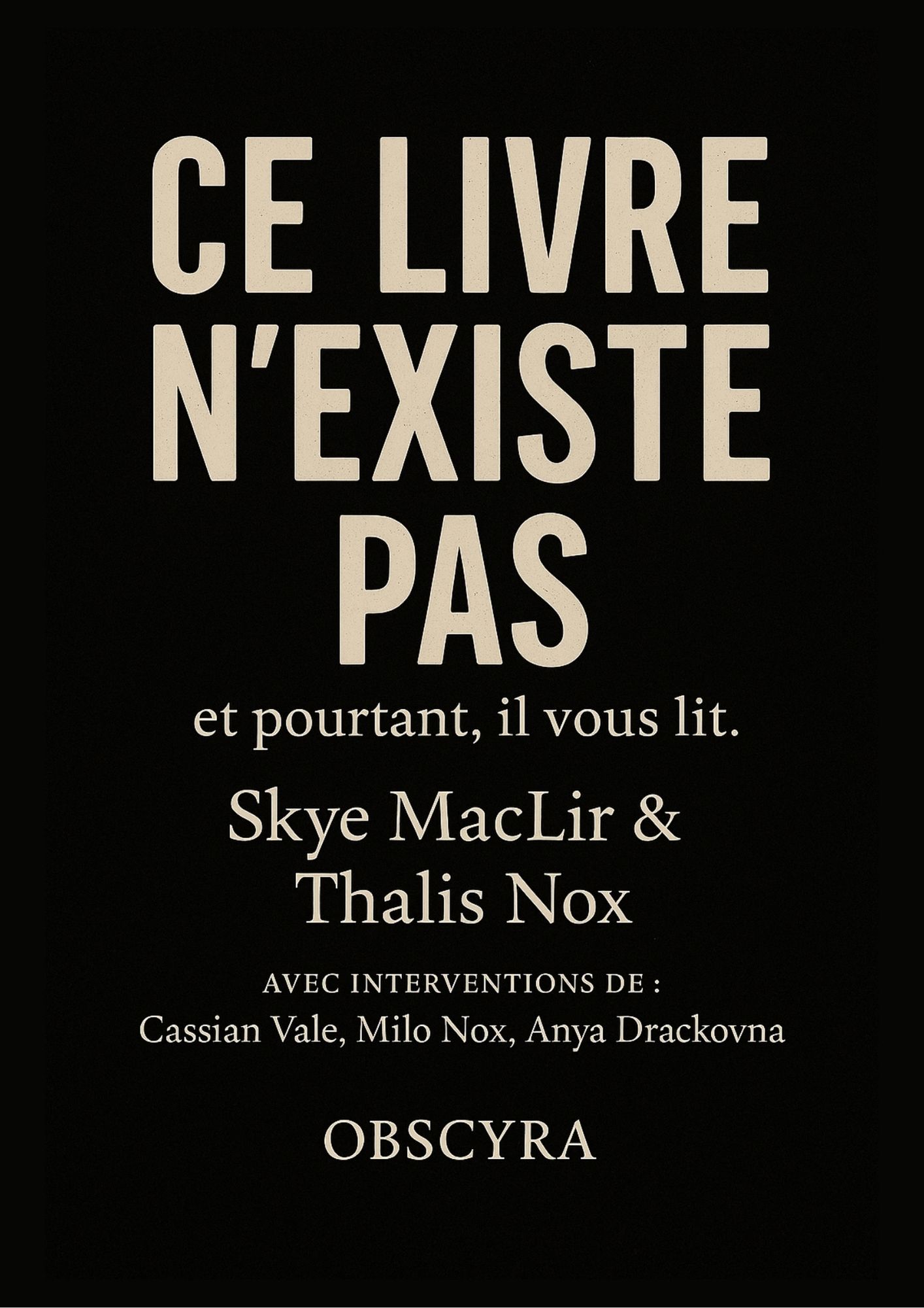 Le texte est traversé par trois autres voix — Cassian Vale, Milo Nox, Anya Drakovna — qui viennent enfoncer les clous : pouvoir, illusion, déni collectif. Ce livre est une conjuration contre l’endormissement. Il parle à ceux qui n’en peuvent plus des simulacres, à ceux qui veulent que ça casse pour que ça pense.