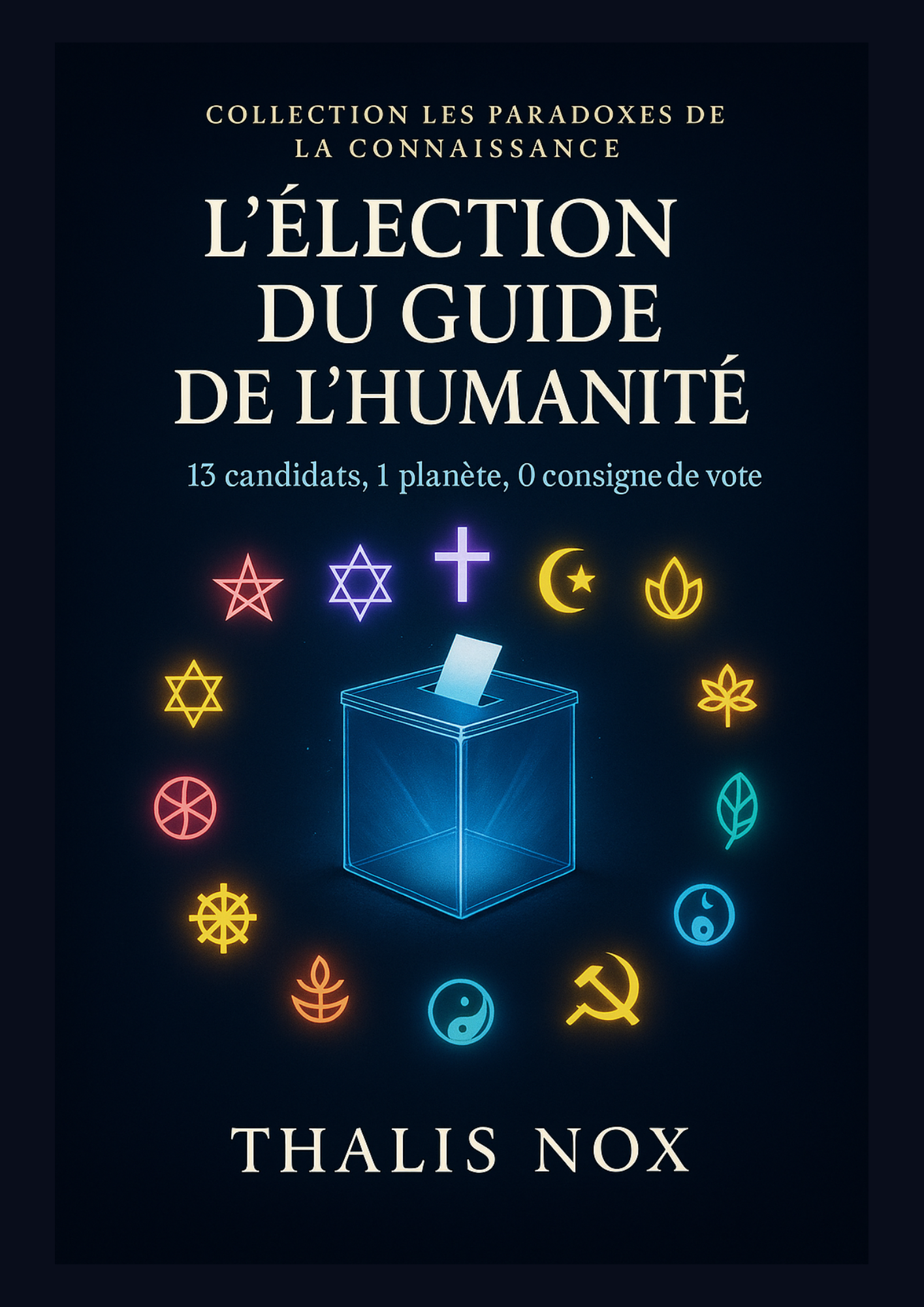 Imagine une élection planétaire où chaque grande croyance, philosophie ou idéologie présente son candidat pour guider l’humanité. Treize prétendants s’affrontent : christianisme, islam, bouddhisme, judaïsme, hindouisme, taoïsme, athéisme, communisme, écologie, spiritualités alternatives… Tous revendiquent la vérité, la paix, ou le salut. Mais qui choisir ? Dans ce livre satirique et provocateur, Thalis Nox fait dialoguer ces courants majeurs comme dans un grand débat électoral. Vérités absolues, promesses contradictoires, failles doctrinales : tout est passé au crible. Loin des dogmes, ce livre pousse à réfléchir, à douter, et surtout à ne pas voter les yeux fermés. Un essai audacieux et lucide sur la quête de sens, de pouvoir et de transcendance qui façonne notre monde depuis des millénaires. Un indispensable pour celles et ceux qui veulent penser librement dans un monde saturé de certitudes.